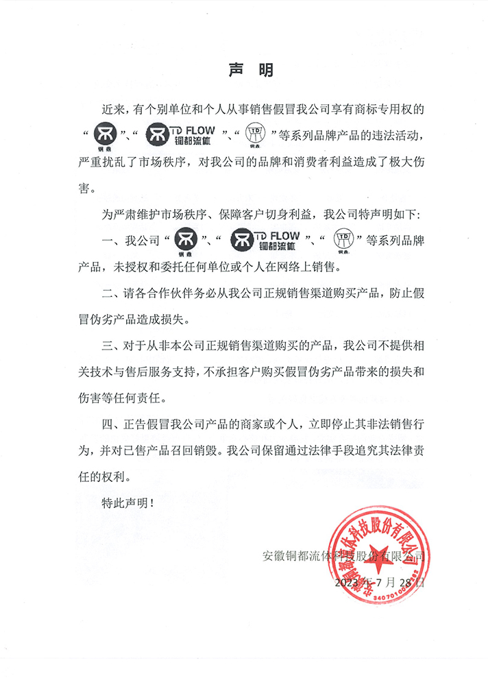 關于打擊不法銷售假冒偽劣“銅都流體”產品的聲明。