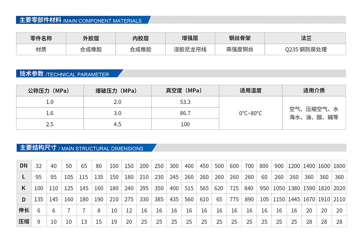 由織物增強的橡膠件,一般由內膠層、織物增強層、鋼絲圈、外膠層經硫化成橡膠件后與松套金屬法蘭組成,用于管道隔振降噪、補償位移的接頭??裳a償軸向位移、徑向位移和角向位移。具有耐壓高、彈性好、位移量大、平衡管道偏差、吸收振動、降低噪音效果好。