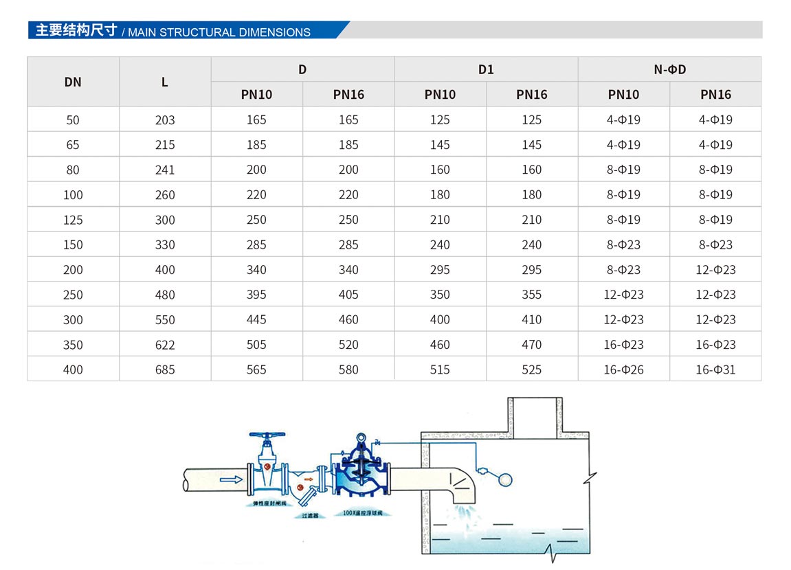 該閥門能有效地控制水塔或水箱液面,適時切斷或打開閥芯輸入水充或阻止水流外泄。液位控制準,水位不受壓力波動干擾,開團緊密不漏水,浮球靈活,維護保養簡單(控制球閥可與主閥分離安裝),適用于工礦,企業,高層建筑中的水箱,水池,水塔的自動供水系統。