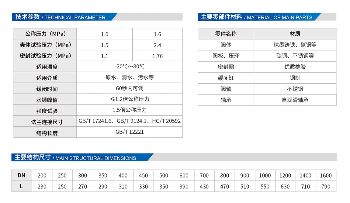 蝶形緩閉止回閥主要用于凈水、原水、污水、海水等介質的供、排水管道上,安裝在水泵出口處,用以截斷介質的回流,消除水錘,保護管道、水泵的安全運行。其主要特點:體形小、重量輕、結構長度只有旋啟式止回閥的三分之一左右。帶外置阻尼油缸,緩閉性能優良,不受管道中介質的影響,閥瓣先速關后緩閉,可防止破環性水錘。橡膠軟密封,結構密封性能好,耐磨損,使用壽命長。橡膠緩沖,運行平穩,無震動及噪音,比老式止回閥流阻小,有明顯的節能效果。